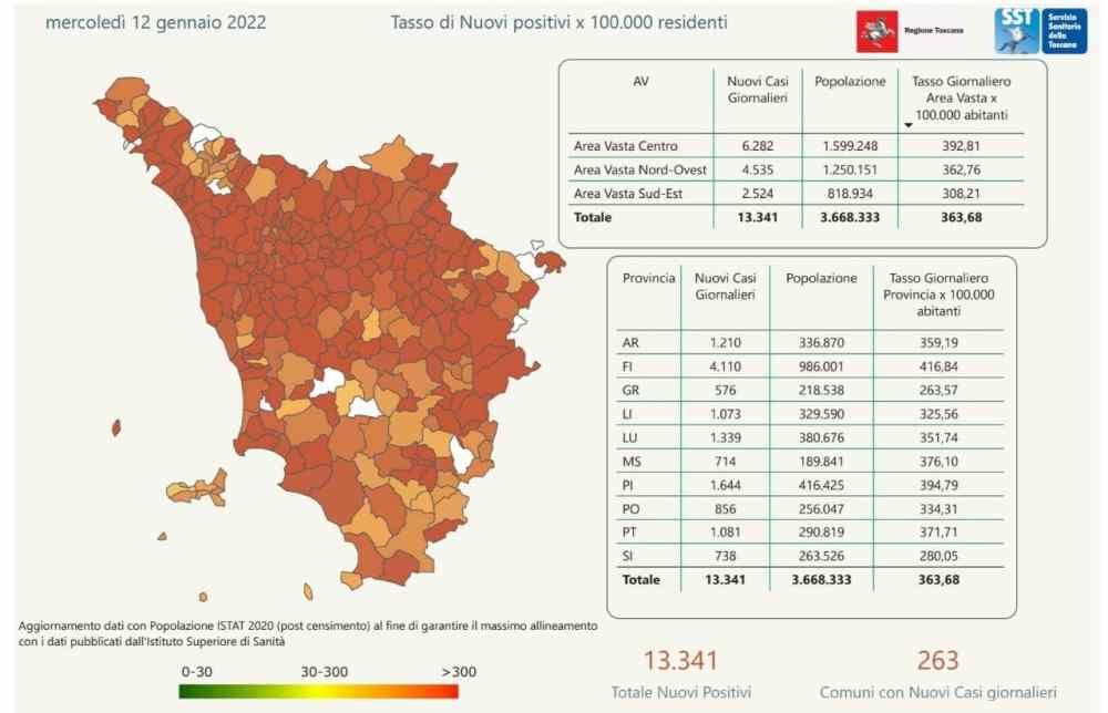 I nuovi casi registrati in Toscana sono 13.341 su 72.195 test di cui 25.068 tamponi molecolari e 47.127 test rapidi. Il tasso dei nuovi positivi è 18,48% (69,6% sulle prime diagnosi).