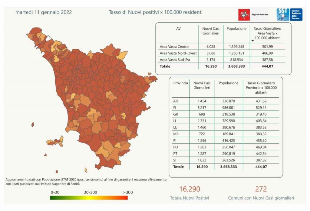 I nuovi casi registrati in Toscana sono 16.290 su 87.520 test di cui 20.951 tamponi molecolari e 66.569 test rapidi. Il tasso dei nuovi positivi è 18,61% (77,4% sulle prime diagnosi).