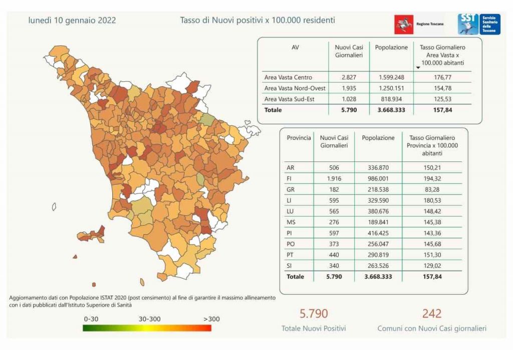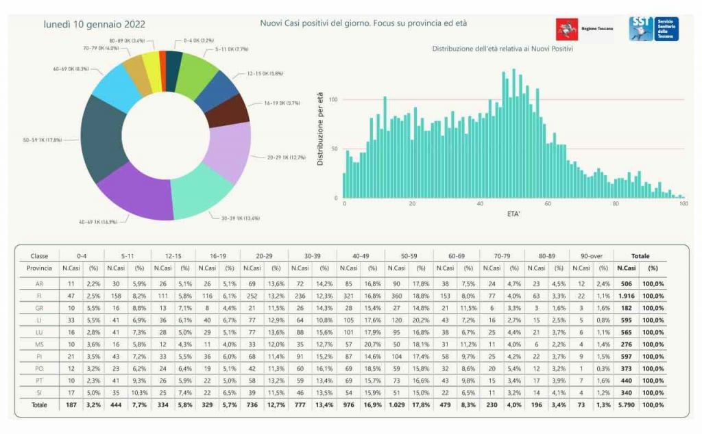 I nuovi casi registrati in Toscana sono 5.790 su 30.157 test di cui 15.722 tamponi molecolari e 14.435 test rapidi. Il tasso dei nuovi positivi è 19,20% (59,6% sulle prime diagnosi).