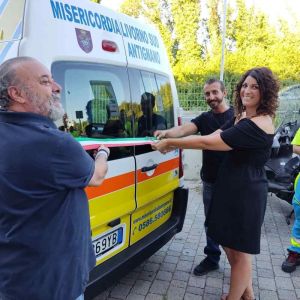 A tagliare il nastro del nuovo mezzo, la Famiglia Lenzi (Gianluca, Daniela e la figlia Elisa) da molti anni volontari della Misericordia segno e simbolo di solidarietà familiare per gli altri.