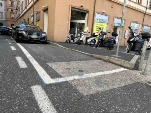 Le situazioni paradossali non finiscono qui. Un’altra immagine mostra uno scivolo posizionato nei pressi di alcune attività commerciali. Anche in questo caso, lo scivolo termina all’interno di un riquadro di parcheggio auto. In pratica, per utilizzare questi scivoli, chi ha mobilità ridotta deve sperare che il parcheggio non sia occupato o attendere pazientemente che il veicolo lasci il posto, trasformando una soluzione di accessibilità in un potenziale punto di frustrazione.