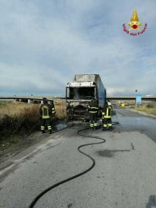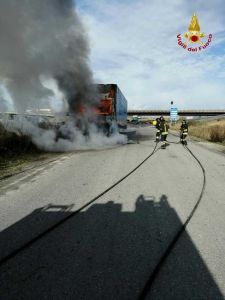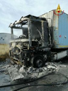 L’incendio ha interessatoil vano motore e la cabina di guida andati completamente distrutti. L’intervento dei vigili del fuoco ha consentito di evitare che l’incendio si propagasse al carico.del Tir.