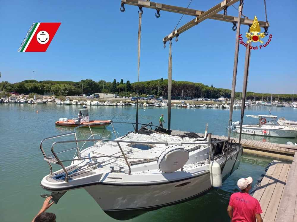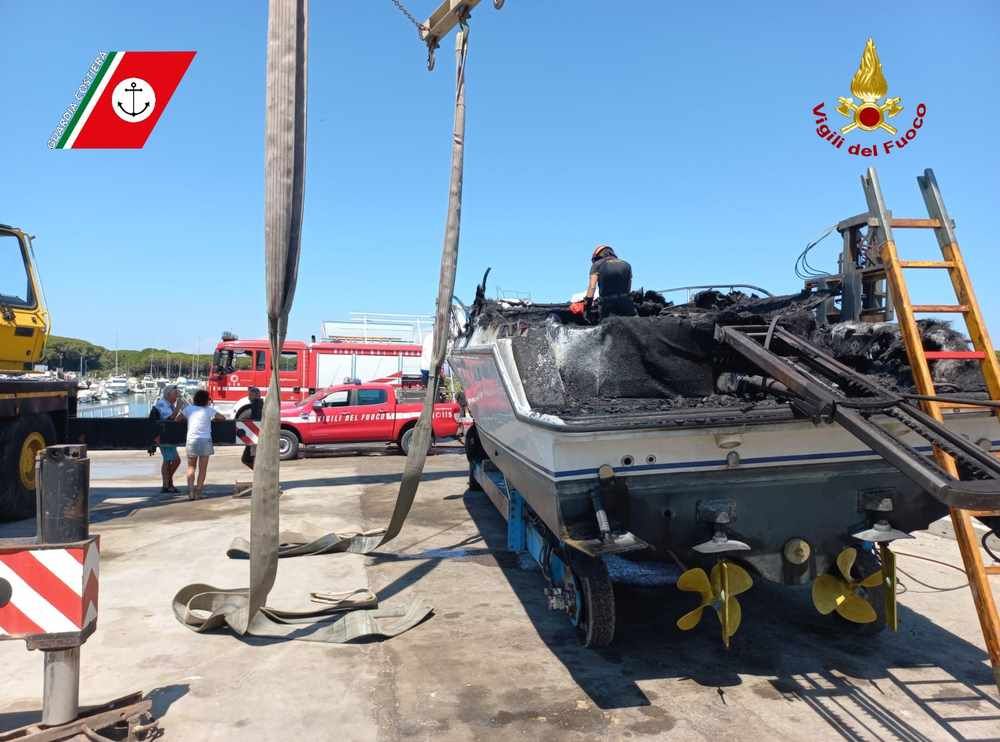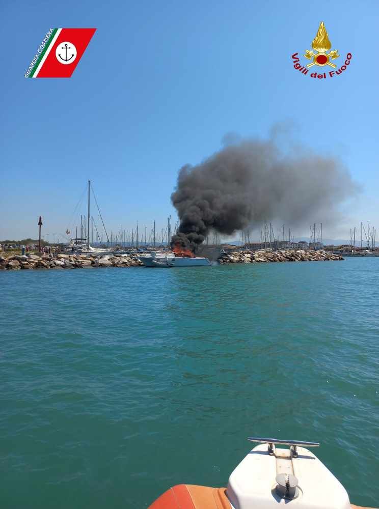 Intervento congiunto coordinato dalla Guardia Costiera vigili del fuoco per le operazioni di estinzione di un incendio intorno a mezzogiorno che ha interessato un natante ormeggiato nel porto di Marina di Cecina.