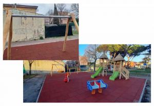 Per le nuove aree gioco inclusive, tutte a norma UNI EN 1176/1177, è stato previsto un allestimento con moduli simili, costituiti da una struttura-gioco composta da doppia torre in robinia con scivoli, un gioco a molla inclusivo a forma di animaletto, un’altalena doppia, un’altalena inclusiva con cesto in polietilene, un dondolo a bilico a due molle.