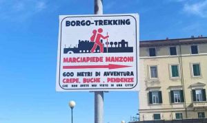 Un cartello posizionato su un palo all’inizio degli Scali Manzoni indica un nuovo percorso turistico dedicato Borgo-Trekking