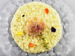 Risotto Carnaroli mantecato al limone con battuta di Scampi e germogli rossi