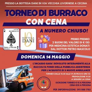 Una nuova iniziativa benefica promossa per raccogliere fondi da destinare all’acquisto delle nuove ambulanze per la Pubblica Assistenza di Cecina. Domenica 14 maggio presso la Bottega Dani (via Vecchia Livornese a Cecina) torneo di burraco con cena.