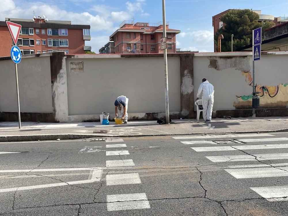 In foto i preparativi del muro sul quale sarà dipinto il murale di Riccardo Cioni in via dei Pensieri. (foto uovoallapop)