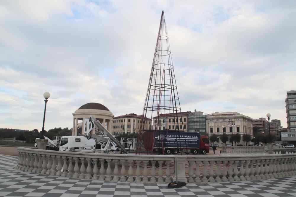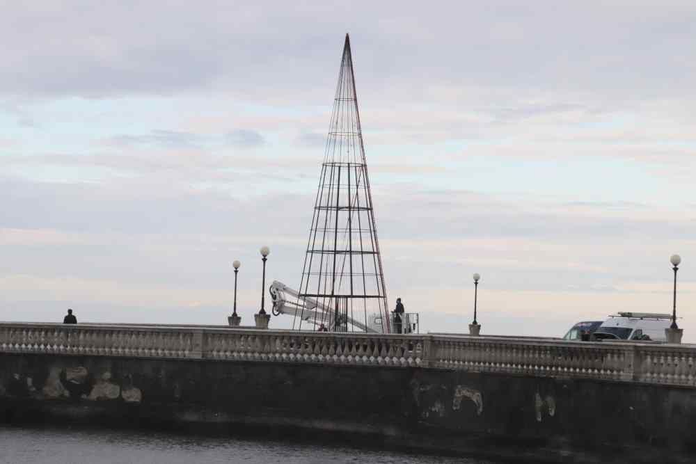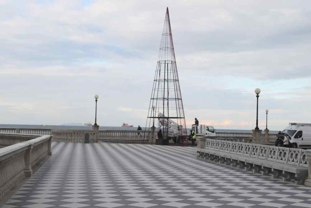 Gli operai stanno montando l’albero di Natale alto 15 metri sul lato Pancaldi della terrazza Mascagni. Una volta terminato, verrà acceso nel pomeriggio ed avranno inizio le riprese per il nuovo spot natalizio della Vodafone.