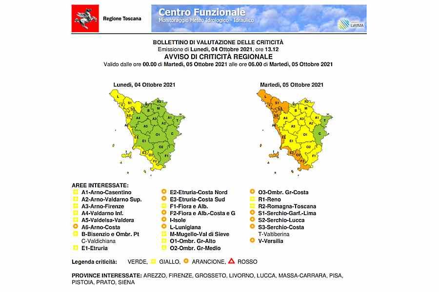 La Protezione Civile Regionale ha infatti emesso in queste ore un bollettino di allerta arancio per temporali forti e rischio idrogeologico idraulico del reticolo minore valido dalle 00 fino alle ore 6 di domani, martedì 5 ottobre.