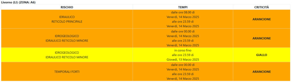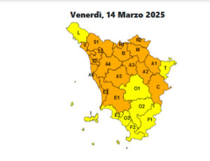 È inoltre prevista un’allerta arancione per rischio idraulico del reticolo principale (per Livorno saranno interessate le zone prossime al canale scolmatore d’Arno) che sarà in vigore domani, giovedì 13 marzo, dalle ore 8 a mezzanotte.