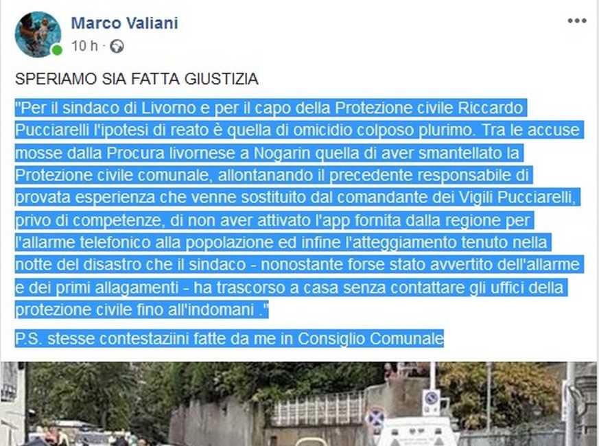 Il cosigliere comunale Marco Valiani si esprime sulla conclusione delle indagini della Procura sui fatti dell’alluvione del 2017 durante la quale persero la vita otto persone.
