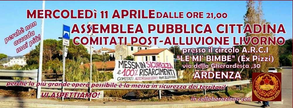 Per tutti questi motivi invitiamo non solo chi ha subito dei danni dall’alluvione ma anche tutti gli altri cittadini livornesi interessati alla sicurezza e al bene della nostra città a partecipare numerosi all’assemblea pubblica che si terrà il giorno mercoledì 11 Aprile dalle ore 21,00 presso i locali del circolo A.R.C.I. “Le mi’ Bimbe” (Ex “Pizzi”) di via della Gherardesca n° 30 a Ardenza.