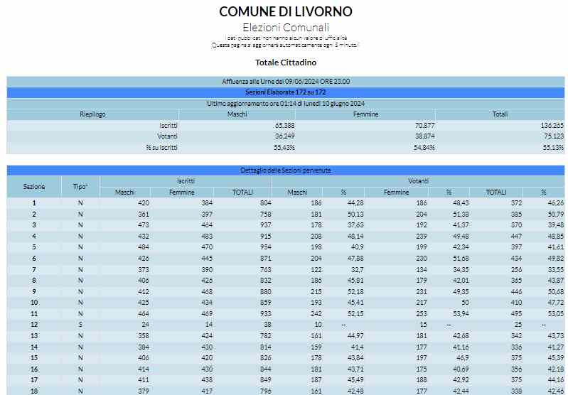 Livorno 10 giugno 2024 – Amministrative, il 45% dei livornesi non ha votato, tutti i dati dei votanti