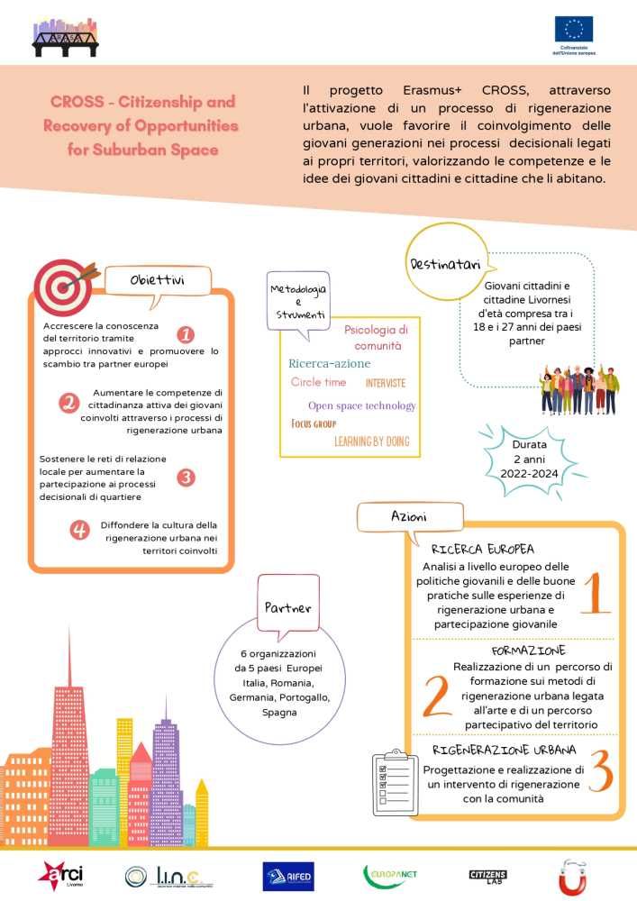 Presso il centro civico in via Fratelli Bandiera 23, alla presenza della Vice Sindaca del Comune di Livorno Libera Camici; dell’assesore del Comune di Livorno Andrea Raspanti e delle associazioni del territorio; Arci Livorno e Linc scs Onlus hanno presentato il progetto “CROSS – Citizenship and Recovery of Opportunities for Suburban Space” nell’ambito del programma Erasmus che vede Livorno come capofila di 5 paesi europei impegnati nella costruzione di percorsi di cittadinanza attiva per giovani fino ai 27 anni.