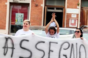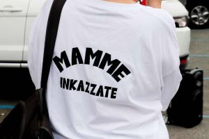 Le “Mamme Inkazzate” (come scritto sulla maglia da loro indossata) manifestano di fronte all’Inps di Livorno