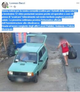 Questa la sua comunicazione ufficiale: “Buona notizia per la nostra comunità (cattiva per i furbetti della spazzatura): a brevissimo 12 video postazioni saranno pronte ed operative e così chi pensa di “scaricare” letteralmente sul nostro territorio pagherà sanzioni salate. La prossima settimana prevista l’informativa ufficiale dell’Amministrazione alla cittadinanza. Grazie al lavoro congiunto degli uffici Lavori Pubblici, Ambiente e Polizia Municipale”.