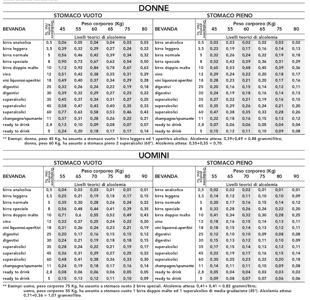 I valori di ALCOLEMIA, calcolati in base al sesso, al peso corporeo e all’essere a stomaco vuoto o pieno, sono solo indicativi e si riferiscono ad una assunzione entro i 60-100 minuti precedenti