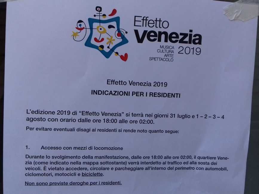 Livorno – Nessuna deroga, neppure per i residenti; anzi soprattutto per i residenti in Venezia. Chi abita nel quartiere, in occasione di Effetto Venezia, dovrà muoversi per forza a piedi. Oltre allo scontato divieto di utilizzo di auto e scooter, nel regolamento c’è anche il divieto – sottolineato e senza deroghe per le bici dalle 18 alle 02. Ma la prescrizione, a giudicare dalle foto che seguono, non è stata molto rispettata.