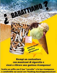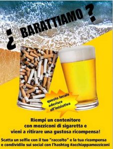Tutti i locali che esporranno queste locandine, offrono una ricompensa (birra, gelato, bibita etc) a chi, aderendo a questa iniziativa, raccoglie un bicchiere di mozziconi nei pressi del locale o nella spiaggia-scogliera vicina (portatevi un paio di guanti).