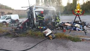 Intervento dei vigili del fuoco del comando di Livorno in via Passaponti per l’incendio di un camper intorno alle 06. 40
