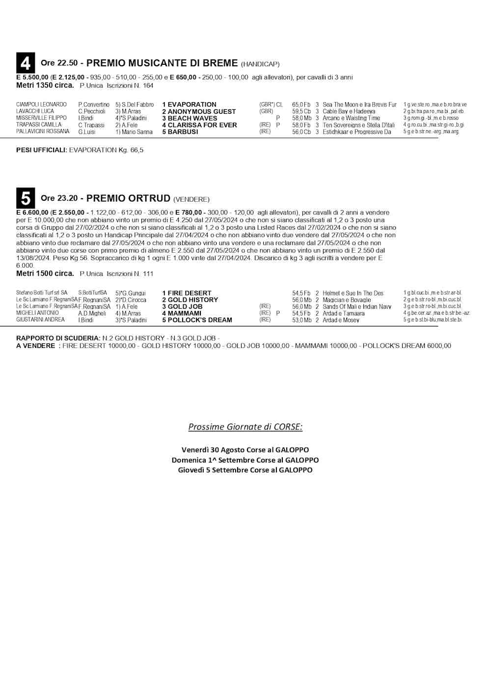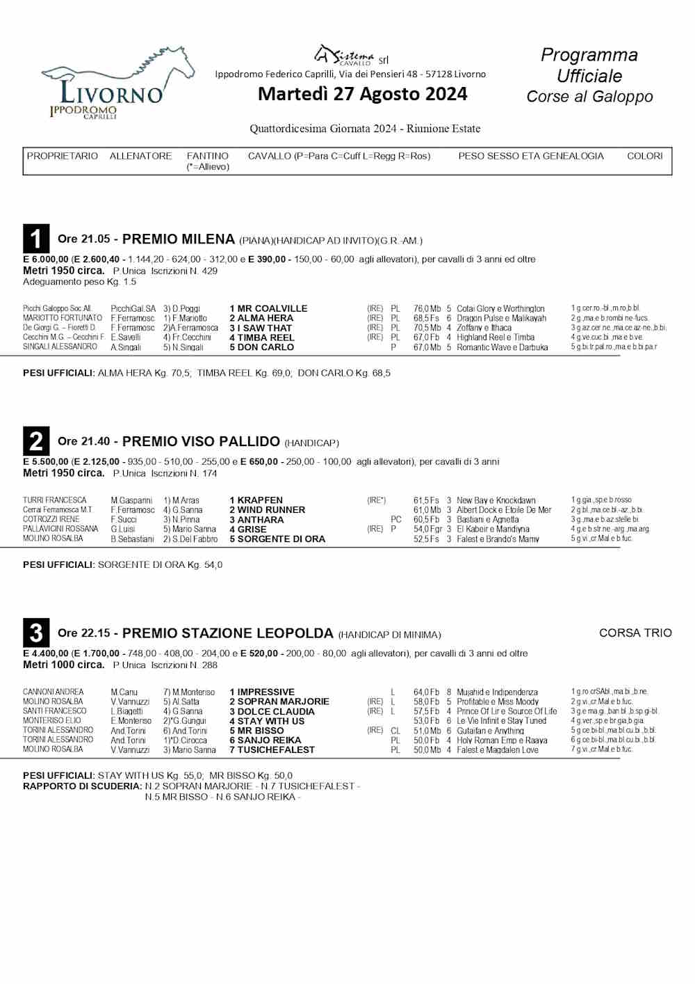 Livorno 27 agosto 2024 – Caprilli: 14^ giornata di corse, il programma