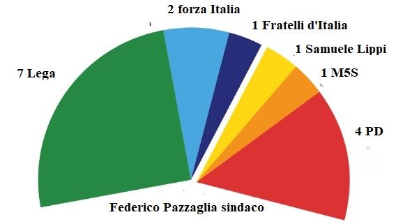 Come evidenziato dal grafico in caso di vittoria di Federico Pazzaglia, 7 consiglieri comunali andrebbero alla Lega, 1 a Fratelli d’Italia e 2 a Forza Italia. All’opposizione andrebbe il candidato sindaco sconfitto al ballottaggio Samuele Lippi,4 consiglieri al PD, 1 consiglieri al Movimento 5 Stelle