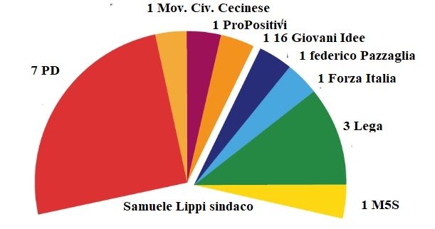 Come evidenziato dal grafico in caso di vittoria di Samuele Lippi, 7 consiglieri comunali andrebbero alPD, 1 al Movimento Civ. Cecinese, 1 a ProPositivi, 1 a 16 Giovani idee. All’opposizione andrebbe il candidato sindaco sconfitto al ballottaggio Federico Pazzaglia,1 consigliere a Fratelli d’Italia, 3, consiglieri alla Lega, 1 consigliere al Movimento 5 Stelle