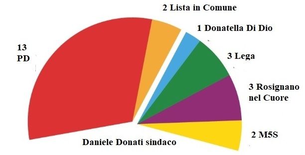 Come evidenziato dal grafico in caso di vittoria di Daniele Donati, 13 consiglieri comunali andrebbero alPD, 2 a Lista in Comune,