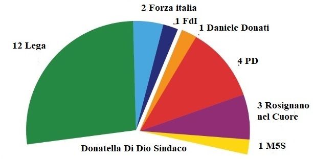 Come evidenziato dal grafico in caso di vittoria di Donatella Di Dio, 12 consiglieri comunali andrebbero alla Lega, 1 a Fratelli d’Italia e 2 a Forza Italia.