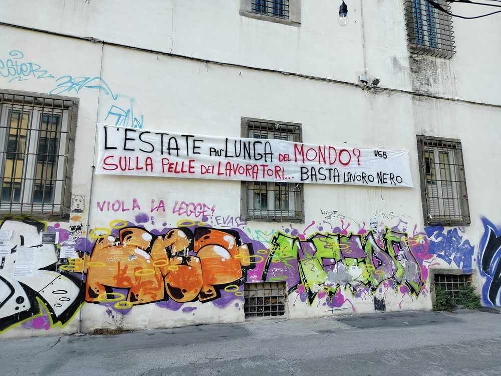 Livorno 16 giugno 2023 – “Cercasi schiavo”, tornano in Venezia i volantini contro lo sfruttamento del lavoro stagionale. C’è anche uno striscione sull’Estate più lunga del mondo