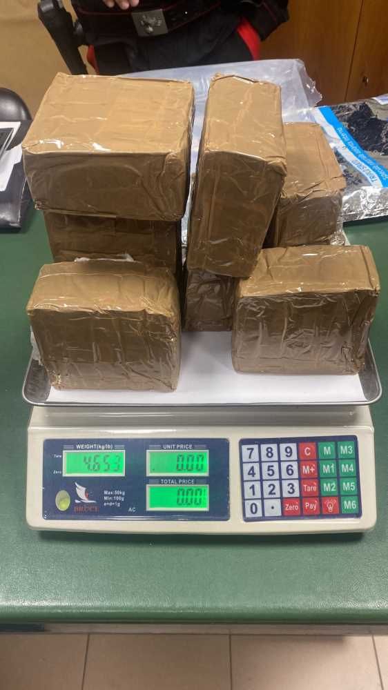 una valigetta con 45 panetti di hashish del peso complessivo di circa 5 chili (valore al dettaglio di quasi 40 mila euro).