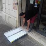 Livorno – Ci troviamo in viale Carducci e anche qui – come in gran parte della città – basta uno scalino per non permettere l’accesso al disabile in carrozzina. Ma ecco la dimostrazione che basta poco, con buona volontà e gentilezza verso il prossimo, a risolvere molti problemi connessi alle barriere architettoniche. Per entrare nella rosticceria/gastronomia “Tutti i gusti” basta suonare il campanello. Il titolare o il dipendente portano fuori una rampa mobile e l’accesso è così garantito veramente a tutti.