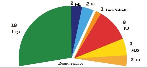 Come evidenziato dal grafico in caso di vittoria di Andrea Romiti, 16 consiglieri comunali andrebbero alla Lega, 2 a Fratelli d’Italia e 2 a Forza Italia. All’opposizione andrebbe il candidato sindaco sconfitto al ballottaggio Luca Salvetti (Casa Livorno), 6 consiglieri al PD, 3 consiglieri al Movimento 5 Stelle e 2 a Buongiorno Livorno