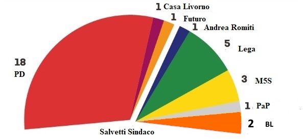 Come evidenziato dal grafico in caso di vittoria di Luca Salvetti, 18 consiglieri comunali andrebbero alPD, 1 a Casa Livorno 1 a Futuro. All’opposizione andrebbe il candidato sindaco sconfitto al ballottaggio Andrea Romiti (Fratelli d’Italia), 5 consiglieri alla Lega, 3 consiglieri al Movimento 5 Stelle e 2 a Buongiorno Livorno