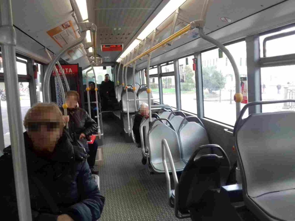 Il nostro giornalista all’interno dei vari autobus passati davanti lui, ha visto scendere dal mezzo pubblico semivuoto una persona con la mascherina che non ha voluto rilasciare dichiarazioni. Ha poi notato una donna seduta di fronte ad altre due persone che rivolgeva il viso verso il finestrino e con la risvolta del maglione a collo alto tirata in su si tappava bocca e naso come se fosse una sorta di protezione fai da te in mancanza di mascherina.
