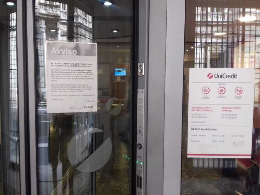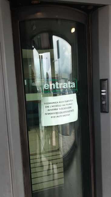 Anche alcune banche hanno iniziato a mettere all’ingresso della porta di accesso il cartello che invita a mantenere la distanza di un metro.
