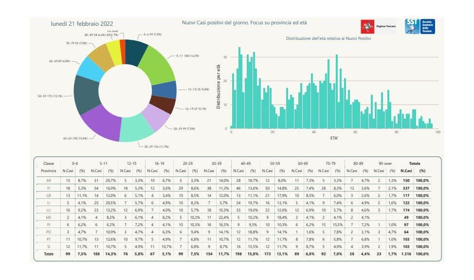 I nuovi casi registrati in Toscana sono 1.316 su 11.630 test di cui 5.157 tamponi molecolari e 6.473 test rapidi. Il tasso dei nuovi positivi è 11,32% (47,3% sulle prime diagnosi).
