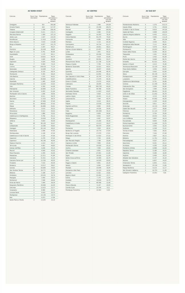 I comuni sono suddivisi per ASL e ordinati in base al tasso di nuovi positivi ogni 100mila abitanti in modo da porre subito l’attenzione delle stesse ASL, ospedali e comuni per i territori che riportano un significativo aumento dei casi.