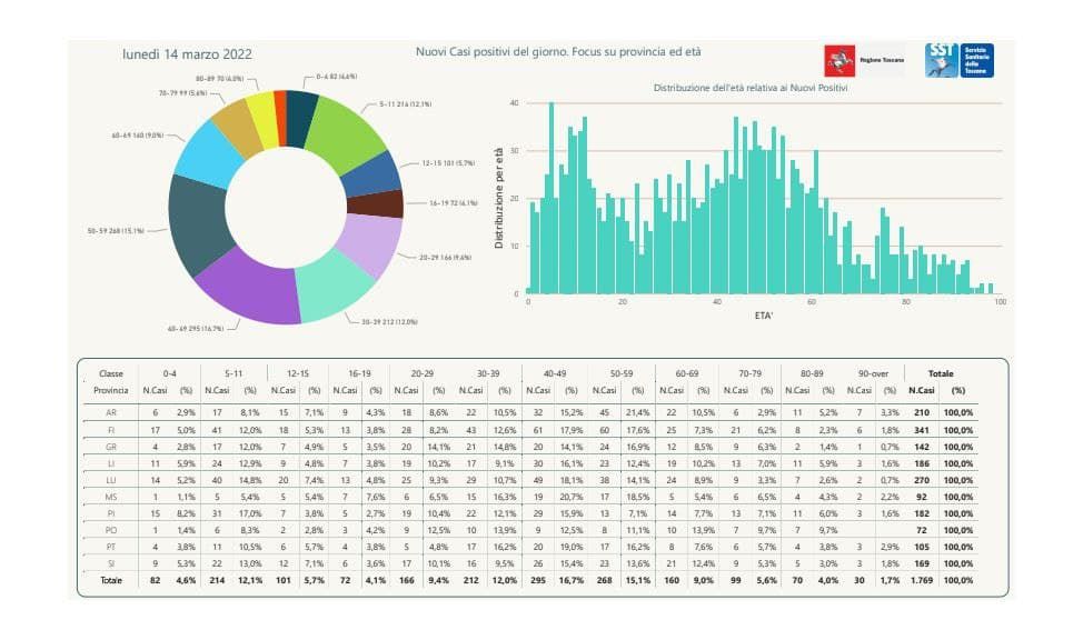 I nuovi casi registrati in Toscana sono 1.769 su 10.539 test di cui 4.400 tamponi molecolari e 6.139 test rapidi. Il tasso dei nuovi positivi è 16,79% (51,7% sulle prime diagnosi).