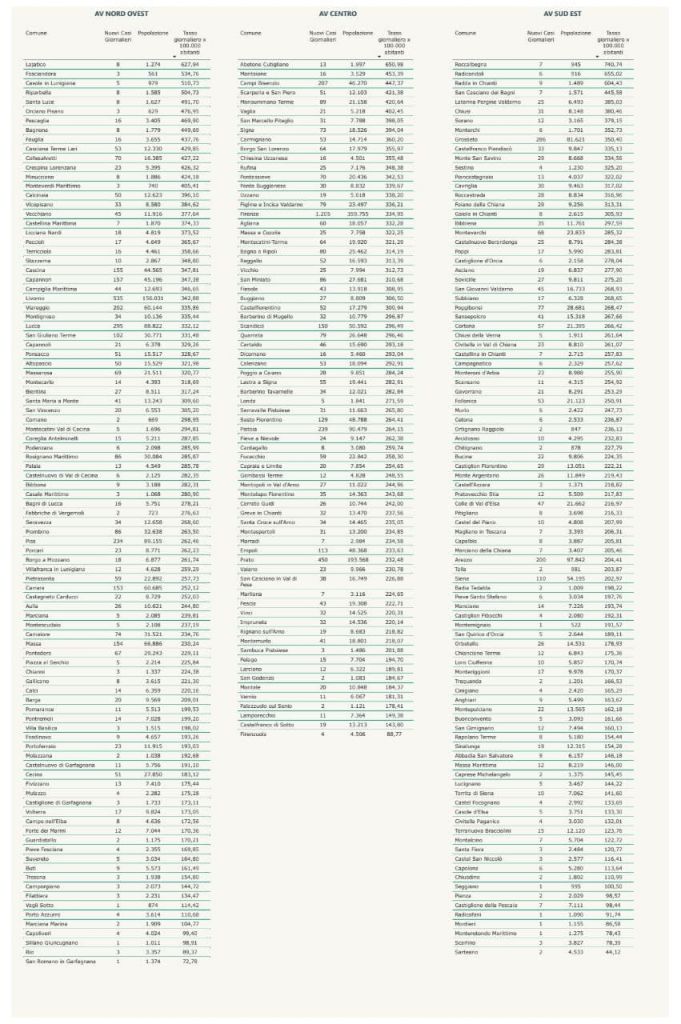 I comuni sono suddivisi per ASL e ordinati in base al tasso di nuovi positivi ogni 100mila abitanti in modo da porre subito l’attenzione delle stesse ASL, ospedali e comuni per i territori che riportano un significativo aumento dei casi.