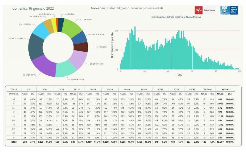 I nuovi casi registrati in Toscana sono 10.287 su 64.007 test di cui 20.600 tamponi molecolari e 43.407 test rapidi. Il tasso dei nuovi positivi è 16,07% (70,3% sulle prime diagnosi).