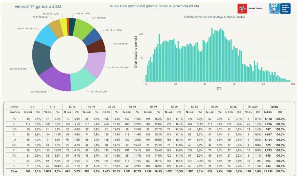 I nuovi casi registrati in Toscana sono 11.859 su 71.095 test di cui 22.670 tamponi molecolari e 48.425 test rapidi. Il tasso dei nuovi positivi è 16,68% (67,3% sulle prime diagnosi).