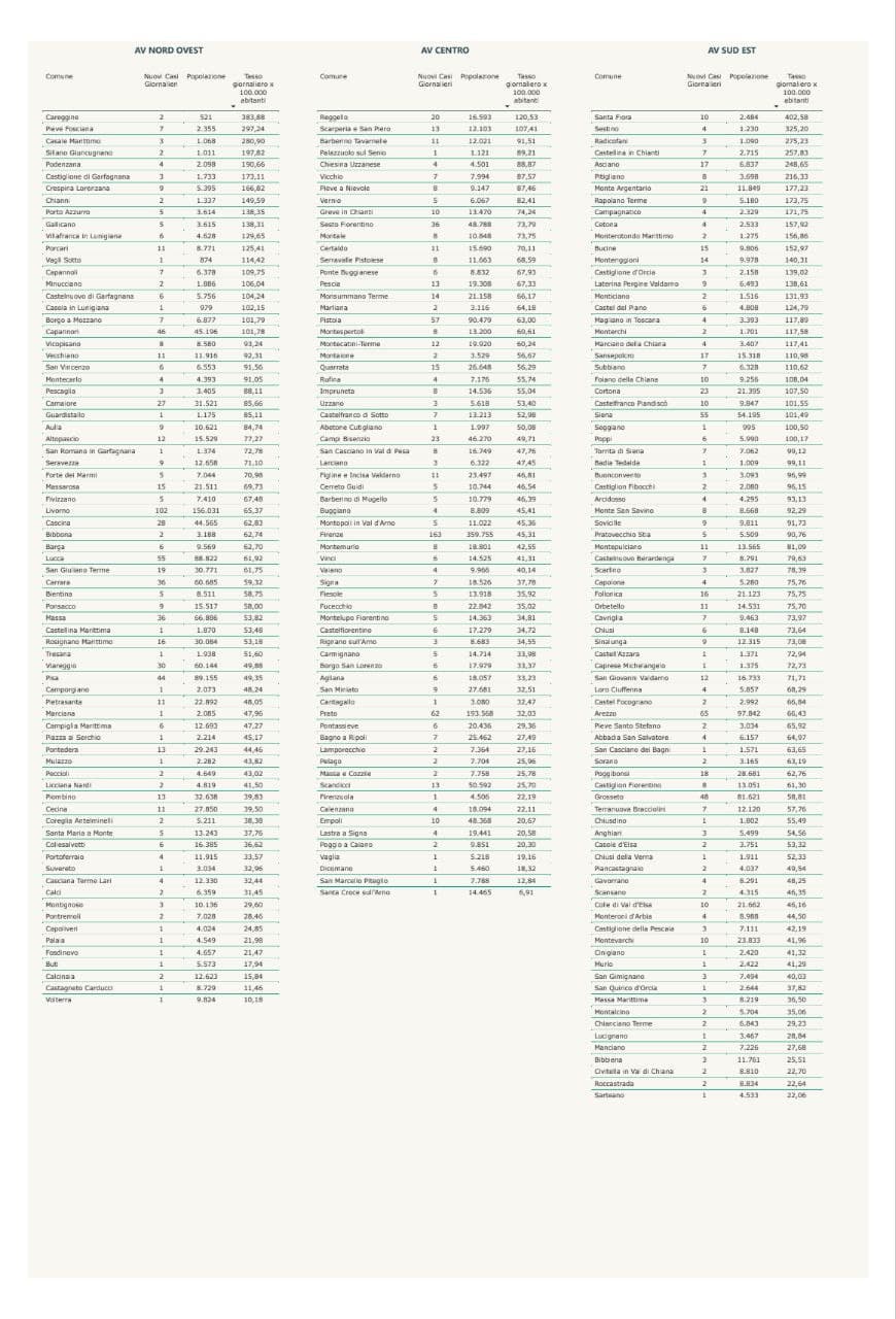 La Toscana si trova al 8° posto in Italia come numerosità di casi (comprensivi di residenti e non residenti), con circa 23.153 casi per 100.000 abitanti (media italiana circa 21.495 x100.000, dato di ieri).
