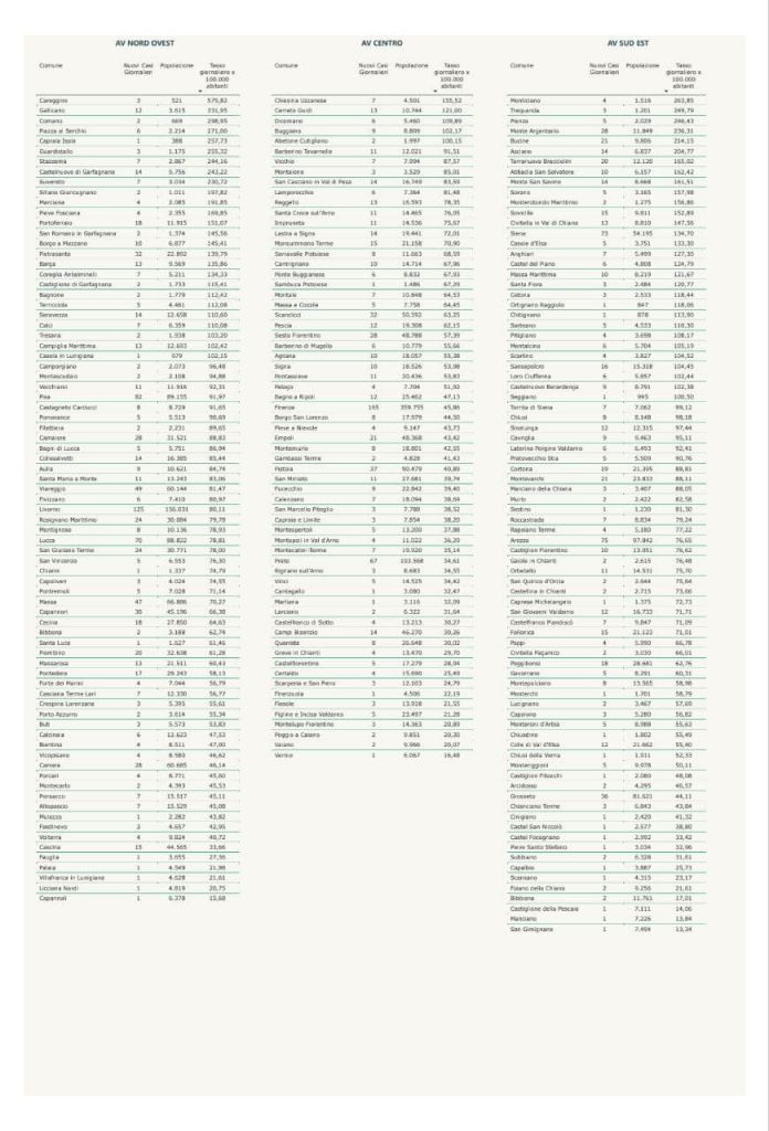 I comuni sono suddivisi per ASL e ordinati in base al tasso di nuovi positivi ogni 100mila abitanti in modo da porre subito l’attenzione delle stesse ASL, ospedali e comuni per i territori che riportano un significativo aumento dei casi.