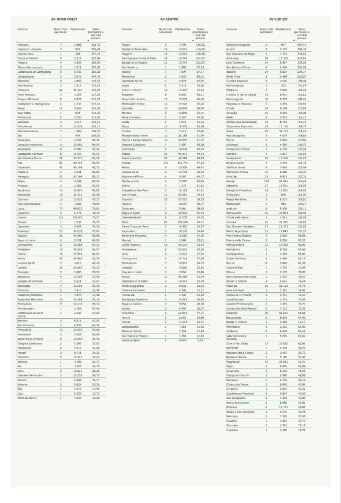 I comuni sono suddivisi per ASL e ordinati in base al tasso di nuovi positivi ogni 100mila abitanti in modo da porre subito l’attenzione delle stesse ASL, ospedali e comuni per i territori che riportano un significativo aumento dei casi.