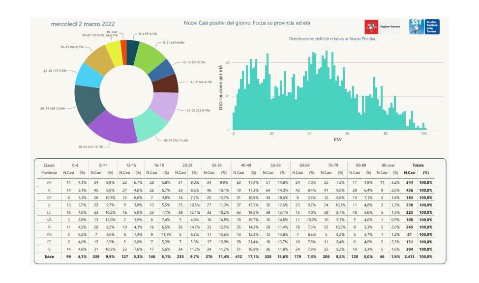 I nuovi casi registrati in Toscana sono 2.413 su 24.388 test di cui 7.414 tamponi molecolari e 16.974 test rapidi. Il tasso dei nuovi positivi è 9,89% (47,5% sulle prime diagnosi).