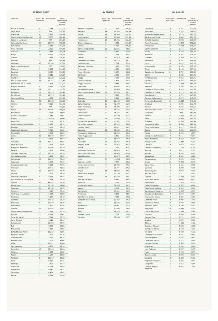 I comuni sono suddivisi per ASL e ordinati in base al tasso di nuovi positivi ogni 100mila abitanti in modo da porre subito l’attenzione delle stesse ASL, ospedali e comuni per i territori che riportano un significativo aumento dei casi.