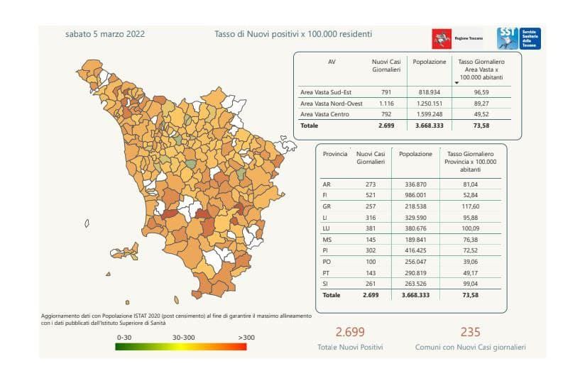 I nuovi casi registrati in Toscana sono 2.699 su 23.215 test di cui 6.525 tamponi molecolari e 16.690 test rapidi. Il tasso dei nuovi positivi è 11,63% (50,0% sulle prime diagnosi).