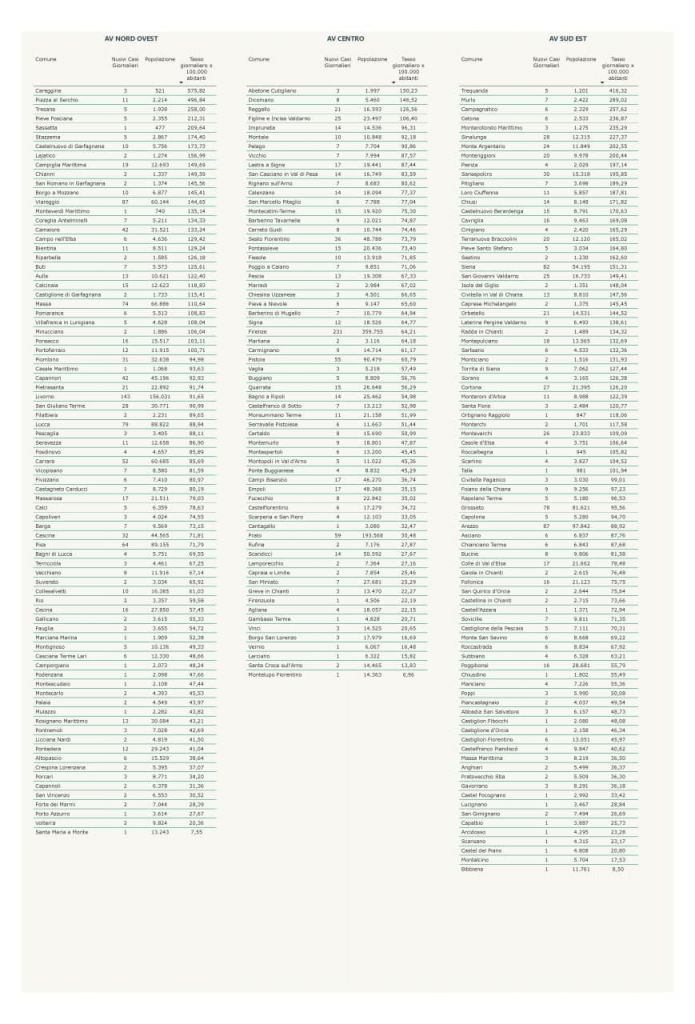 I comuni sono suddivisi per ASL e ordinati in base al tasso di nuovi positivi ogni 100mila abitanti in modo da porre subito l’attenzione delle stesse ASL, ospedali e comuni per i territori che riportano un significativo aumento dei casi.